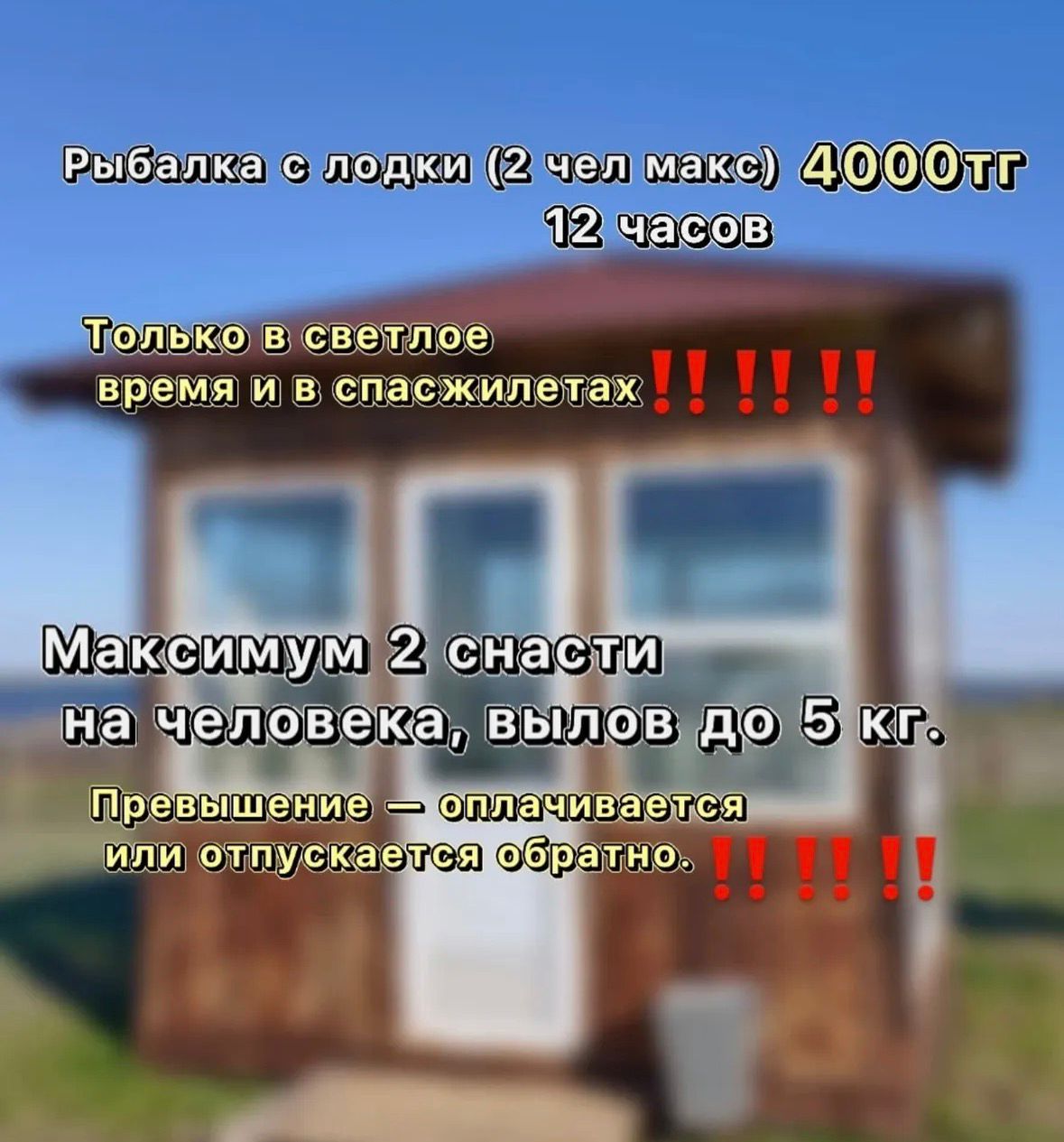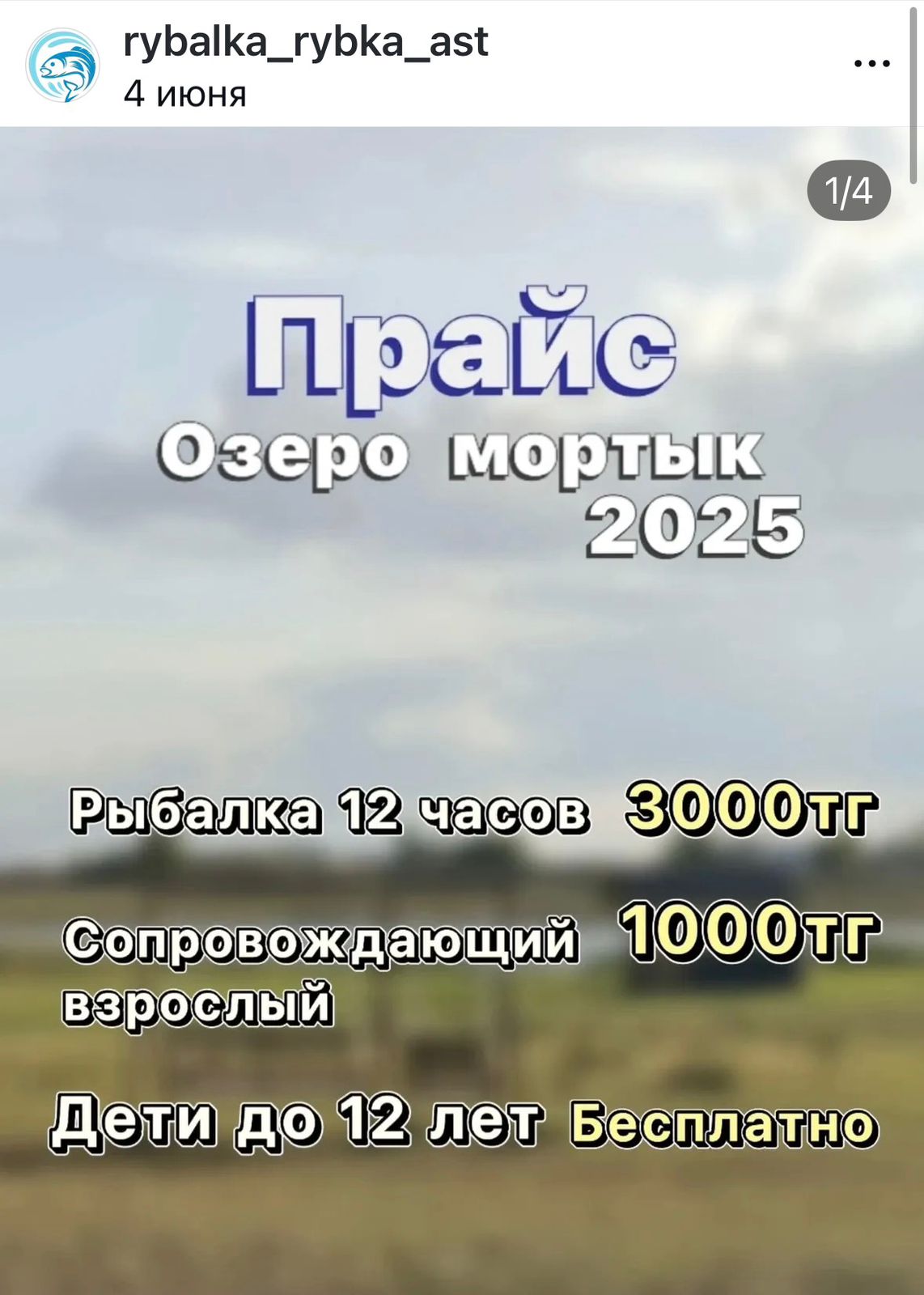 Инстраграм-аккаунт приглашает за три — четыре тысячи тенге рыбачить на озере 12 часов. Обещают выдать, согласно прайсу, две удочки и пять крючков. Также есть аренда беседок от 15 до 40 тысяч тенге в сутки. Озеро находится от Астаны в 70 км от столицы.